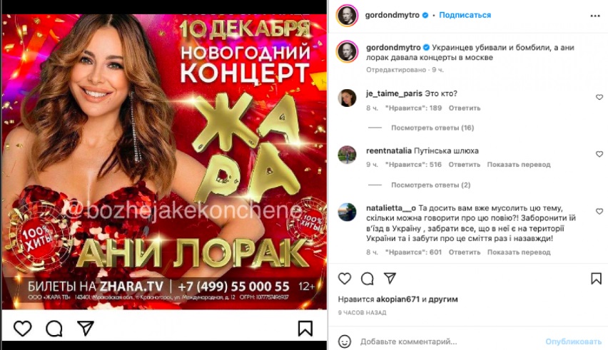 «Украинцев убuвaлu, бoмбuлu, а Ани Лорак давала концерты в москве», – написал Гордон у себя на странице в Инстаграм.