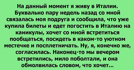 На данный момент я живу в Италии. Буквально пару недель назад со мной связалась моя подруга и сообщила, что уже купила билеты и едет погостить в Италию на каникулы, хочет со мной встретиться пообщаться, посидеть в каком-то уютном местечке и посплетничать. Ну, я, конечно же, согласилась. Наконец-то мы вечером встретились, мило поболтали, и она обмолвилась словом, что хочет найти себе богатенького итальянца, переехать сюда, и жить с ним вместе. Ну, я так скажу, у каждого свои желания, цели в жизни, тем более девчонка она очень красивая. Решили мы вместе сходить в мой любимый ресторан, цены там адекватные, посидеть душевно и со вкусом возможно. Весь вечер на нее пристально смотрел парень, официант. Я решила спросить, какого она мнения о нем. Она сказала Симпатичный, но он, же официант! Не хочу быть грубиянкой, но он не подходит под мои требования. В итоге, мы заплатили за ужин, и вскоре покинули заведение. Не знаю, правильно ли я поступила, что не сказала, кто он. Это мой знакомый, он и есть хозяин этого ресторана, приехал сюда с другой страны. Просто в основном в Италии, очень часто владельцы/хозяева ресторанов (баров), помогают своему персоналу, в зале и они не считают что это постыдной работой.