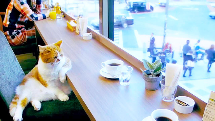 Кошка заходит в кафе, заказывает кофе и пирожное. Официант стоит с открытым ртом. Кошка: