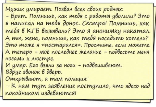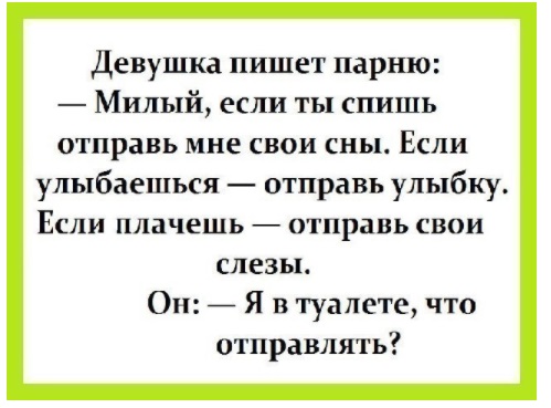 Веселье – это не обязательно танцы, веселая компания и громкая музыка. Порой оно бывает спокойным, но от этого не менее зажигательным. Ведь веселье – это то, что внутри вас, это ваше умение радоваться мелочам и делать себе приподнятое настроение. Но если к вечеру субботы ваш запал немного иссяк, можем подпитать вас порцией веселых шуточек. Они зададут темп, создадут настрой и превратят вашу субботу в настоящий праздник.