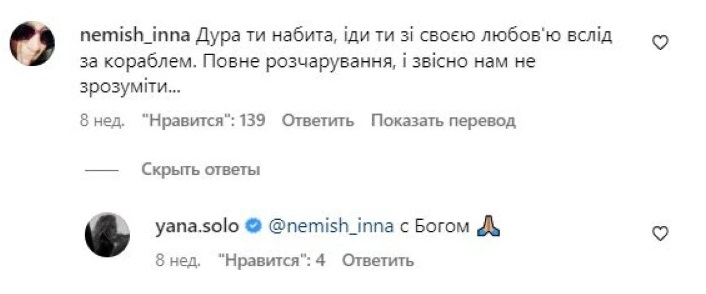 Экс-украинка, а ныне предательница Яна Соломко, известная по украинскому проекту «Холостяк», с началом полномасштабного вторжения рф в Украину, отправилась жить и работать на территорию страны-агрессора. Там она уже вовсю «заразилась» пропагандиским ядом и теперь брызжит им направо и налево в своих комментариях в соцсетях.