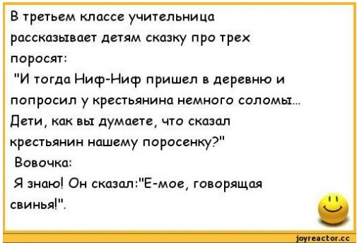 Все мы с детства знаем сказку про трех поросят — Ниф-Ниф, Наф-Наф и Нуф-Нуф. А вот дети, которые ее не знают, могут неожиданно отреагировать на ее сюжет. И как раз об этом — наш первый анекдот.
