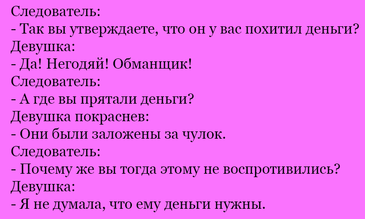Жизнь полна непредвиденных и не всегда приятных ситуаций — порой даже в самый хороший день можно встретить не только хама, но и даже преступника. И именно так случилось с героиней нашего первого анекдота — ее пытались ограбить, а после этого происшествия пришлось еще со следователем объясняться. Но оказалось, что все далеко не однозначно…