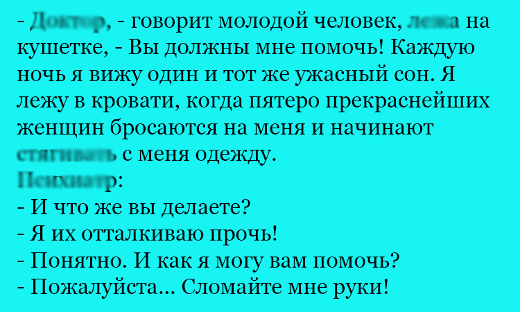 Все мы хотим ночью крепко спать и набираться сил перед предстоящем днем, однако порой сновидения бывают такими яркими и реалистичными, что кажется, что мы не спим, а проживаем отдельную жизнь. с этим столкнулся герой нашего первого анекдота — он видит по ночам довольно специфический сон и пришел к врачу за консультацией с вопросом как это можно изменить…