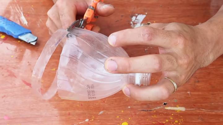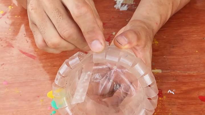 - Наденьте кольцо на нижнюю часть с дном. Теперь возьмите ножницы и сделайте надрезы на пластике до кольца.