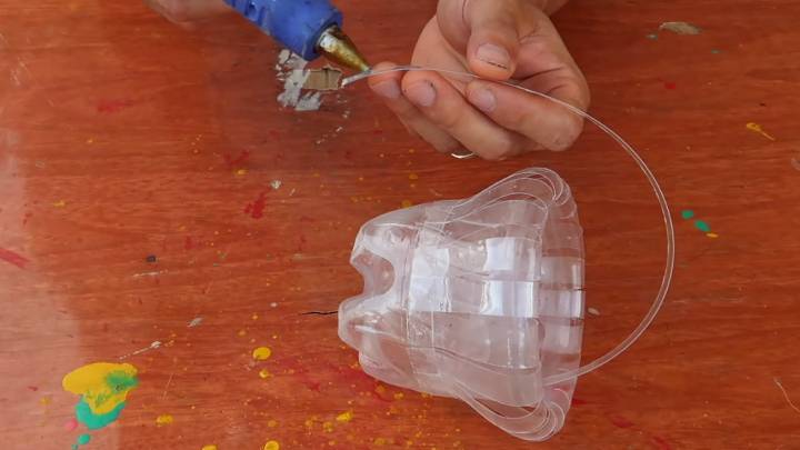 - Из оставшегося пластика вырежьте длинную полоску и приклейте её в качестве ручки.