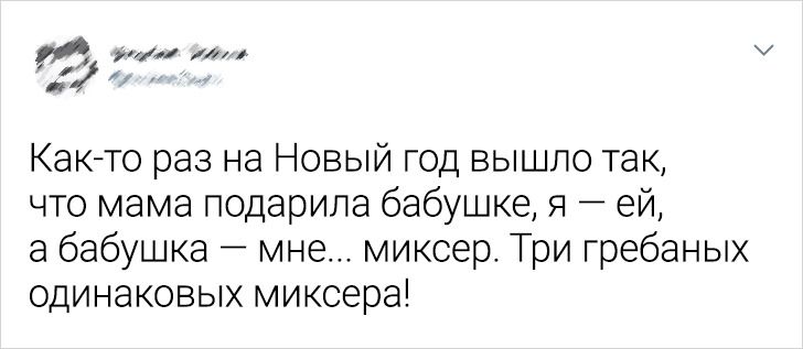 • Ждала от парня предложения руки и сердца. Он месяц все на мои руки заглядывался, ладошками и пальчиками мерился. И вот под Новый год под елкой оказалась подозрительно легкая коробка. Неделю ходила, мечтала. В новогоднюю ночь вскрыли подарки, а там… варежки. Теплые, хорошие варежки, о которых я как-то обмолвилась полгода назад. Размер подобрал идеально, не придраться. © «Подслушано» / Vk