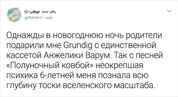 • В тот день наступил новый, 2000 год. Взрослые активно обсуждали какой-то XXI век, а я, собрав все сладости, улеглась под журнальный столик в углу комнаты смотреть «Голубой огонек» и уплетать конфеты, покуда Морфей не принял меня в свои объятия. Мой благостный сон был нарушен причитаниями матери и громкими разговорами. Подумав, что под столом мне не очень комфортно, да и разговаривавшие кругом люди моему сну не способствовали, я решила перебраться в свою комнату. Прихватив коробку конфет, я вылезла из-под стола и прошествовала мимо оторопевших соседей и родственников.