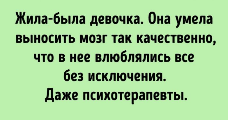 Жила-была девочка. Она умела выносить мозг так качественно, что в нее влюблялись все без исключения. Даже психотерапевты.