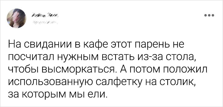 - Настоял на встрече в дорогом заведении (хотя я предлагала кино), сделал заказ на большую сумму, а потом заплатил так, чтобы я была в курсе «итого», — видимо, в качестве контрольного он произнес эту сумму вслух. © sassi_shuna / Twitter