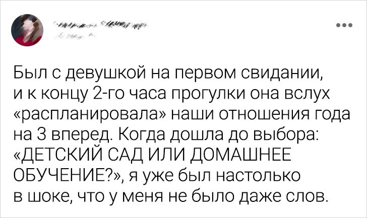 - Мы просто встречались с этим парнем, у нас было всего несколько свиданий. Он был образован, имел хорошую работу, вежливый и все такое. В общем, никаких сигналов. И вот однажды он пригласил меня в гости на пиццу. А я только освободилась после 12-часового рабочего дня, очень устала и написала что-то вроде: «У меня был долгий день, можем ли мы провести его сегодня в непринужденной обстановке? Как насчет штанов для йоги и толстовки?» А он ответил: «Вообще-то нет, когда ты проводишь время со мной, ты должна выглядеть как можно лучше». Я просто перестала ему отвечать. © KissedByFire2194 / Reddit