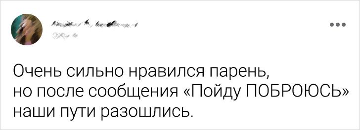 - Я встречался с девушкой, которая невероятно медленно отвечала на сообщения. В принципе, в этом не было ничего такого, с учетом того, что мы просто обсуждали планы на выходные и все такое. Конечно, немного раздражал тот факт, что на планирование уик-энда мог уйти целый день, но, с другой стороны, я не то чтобы гениальный автор СМС. Вот только когда мы проводили время вместе, она мгновенно реагировала, если ей кто-то писал, даже если это был просто приятель, приславший смешную картинку. Я понял, что она просто считала мои СМС менее важными, и мы расстались. © mac-0 / Reddit