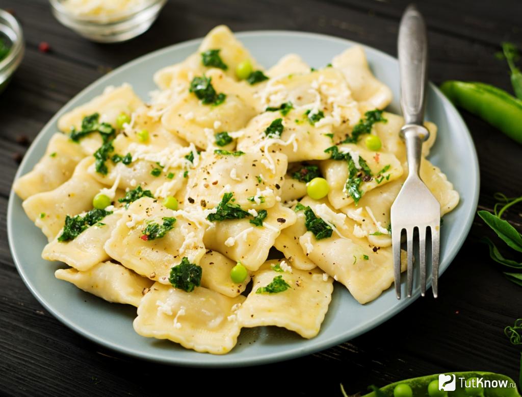 Готовые равиолли можно выложить на досочку, присыпанную мукой и отправить в морозильник. Либо сразу отварить в кипящей подсоленой воде в течение 10 минут.