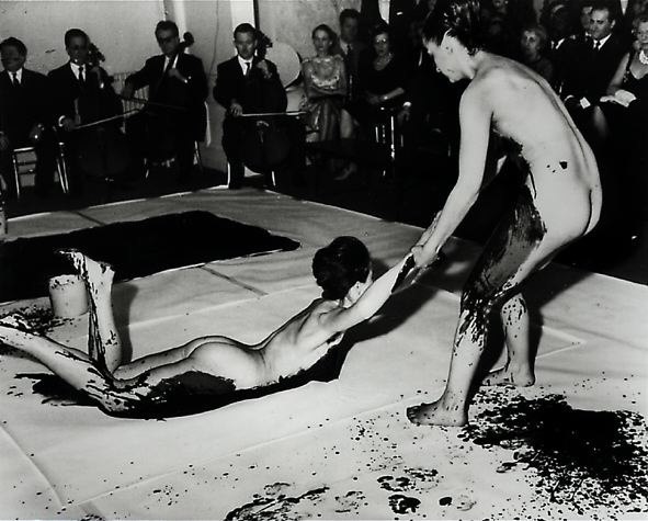Ив Кляйн во время изготовления «произведения» Anthropométries de l’Epoque bleue («Антропометрия голубого периода»); Франция, 1960 г.