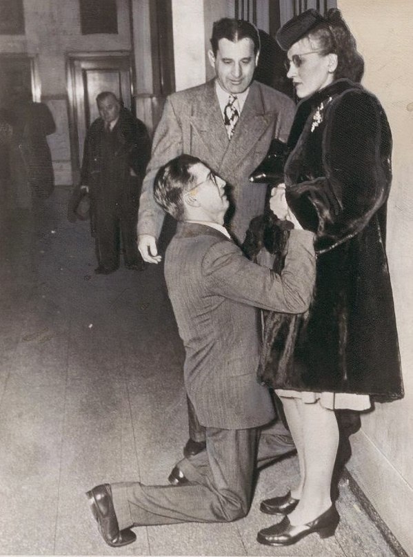 Мужчина в здании суда умоляет свою жену на коленях забрать ее заявление о разводе.