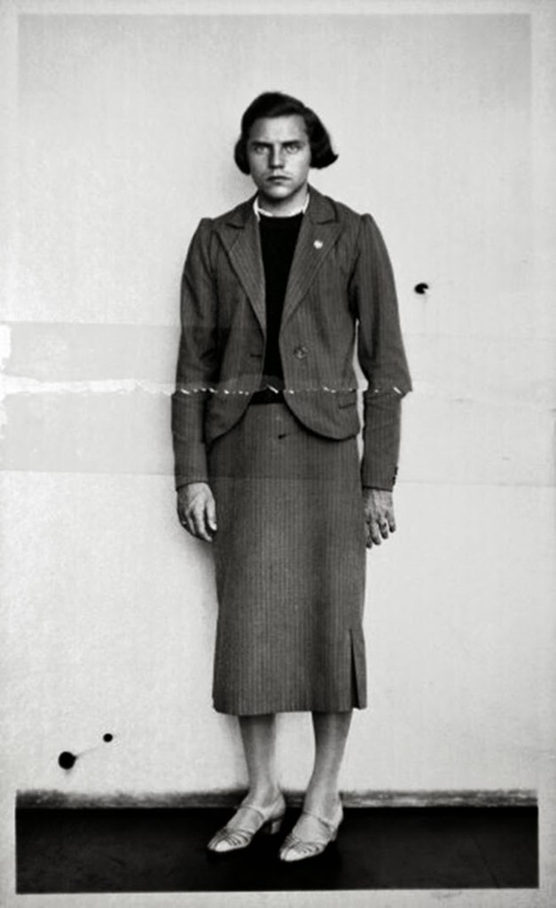 Дора Ратхен, атлетка олимпийской сборной Германии, арестованная на железнодорожной станции по подозрению в том, что была мужчиной, переодетым в женское платье, 1938.