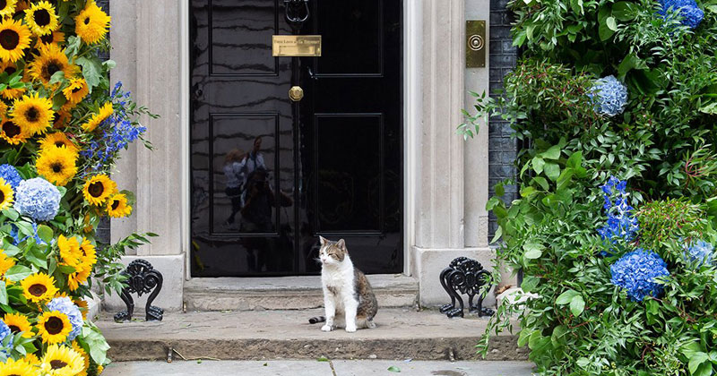 На снимках он запечатлел декорированный вход вместе с котом Ларри, который служит в резиденции правительства Великобритании главным мышеловом. Пост фотографа также продублирован на странице кота в Twitter и уже насобирал тысячи лайков.
