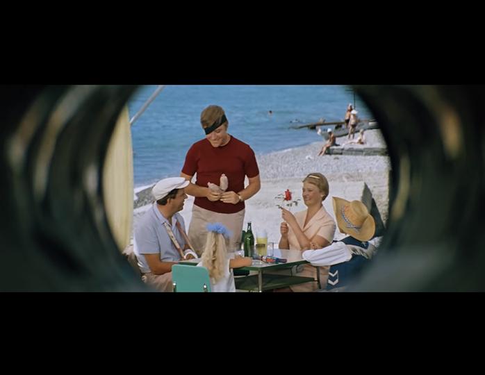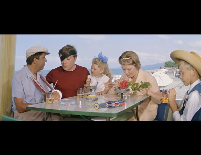 Буквально в следующем кадре со столика исчезают бутылка и желтый стакан с салфетками, зато появляется трехцветная вазочка. К двум красным розам в руках Нины Гребешковой добавляется белый цветок, а эскимо превращается в мороженое в вазочках. Дочь оказывается с другой стороны стола, а под столешницей видна стопка листов с текстом актеров.