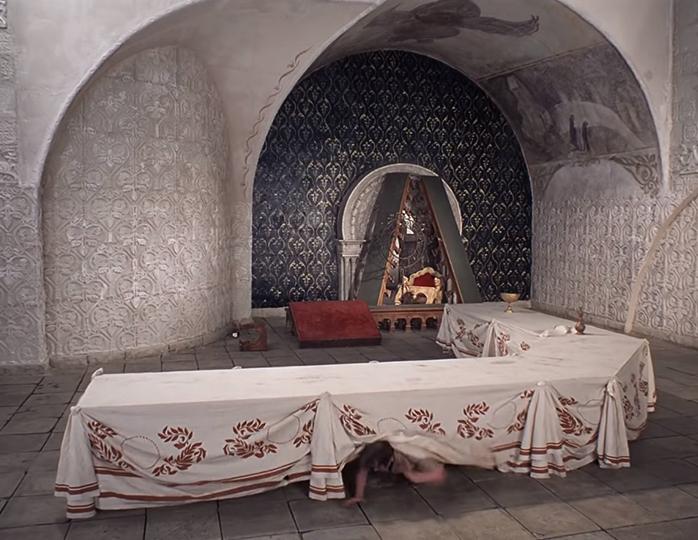 Все это летело в стрельцов. Но в момент, когда все лезут под стол ловить «демонов», оказывается, что в помещении нет ни стульев, ни разбросанной еды, ни кухонной утвари, которыми лихо швырялся вор Жорж Милославский.