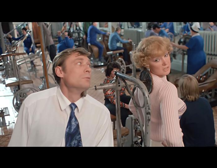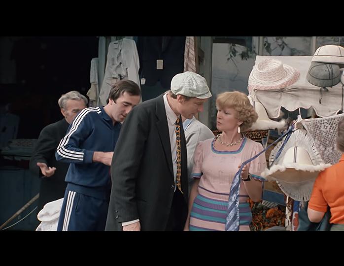 На 38-й минуте фильма Раиса Захаровна в тренажерном зале санатория очаровывает простачка Васю рассказами об инопланетянах. На мужчине голубой галстук. Но после занятий в зале эти двое разгуливают по рынку, где Раиса Захаровна рекомендует Васе купить тот самый галстук, в котором Василий был на механическом массаже шеи.