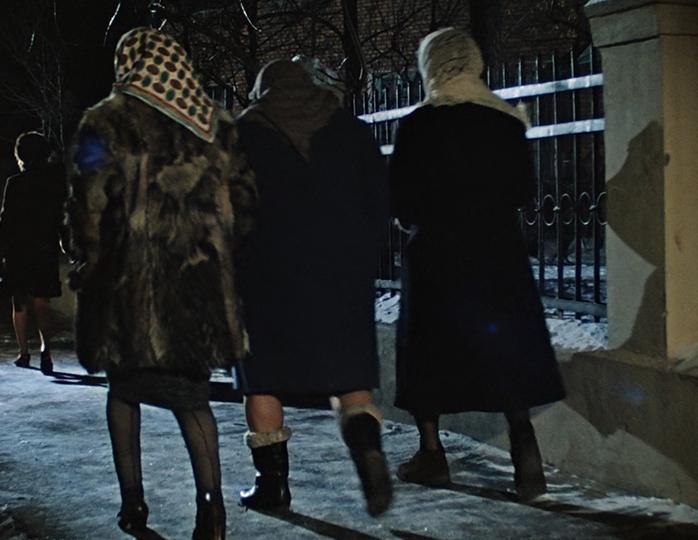 Замаскировавшиеся джентльмены выходят на улицу в женской одежде. На Косом достаточно яркий платок. Но когда троица подходит к театру, на нем уже белая косыночка. Потом первый платок снова на месте. С одеждой тоже выходит курьез.