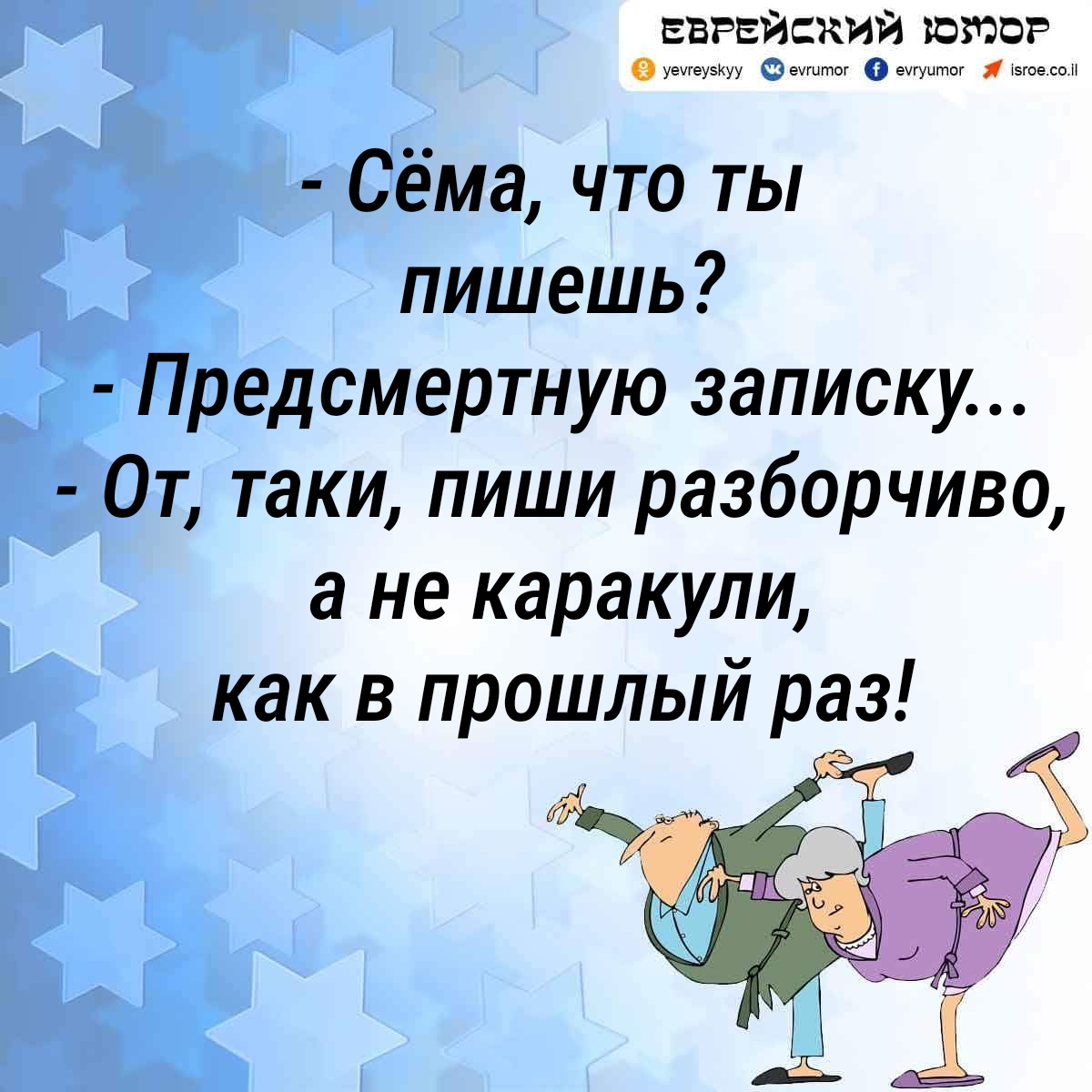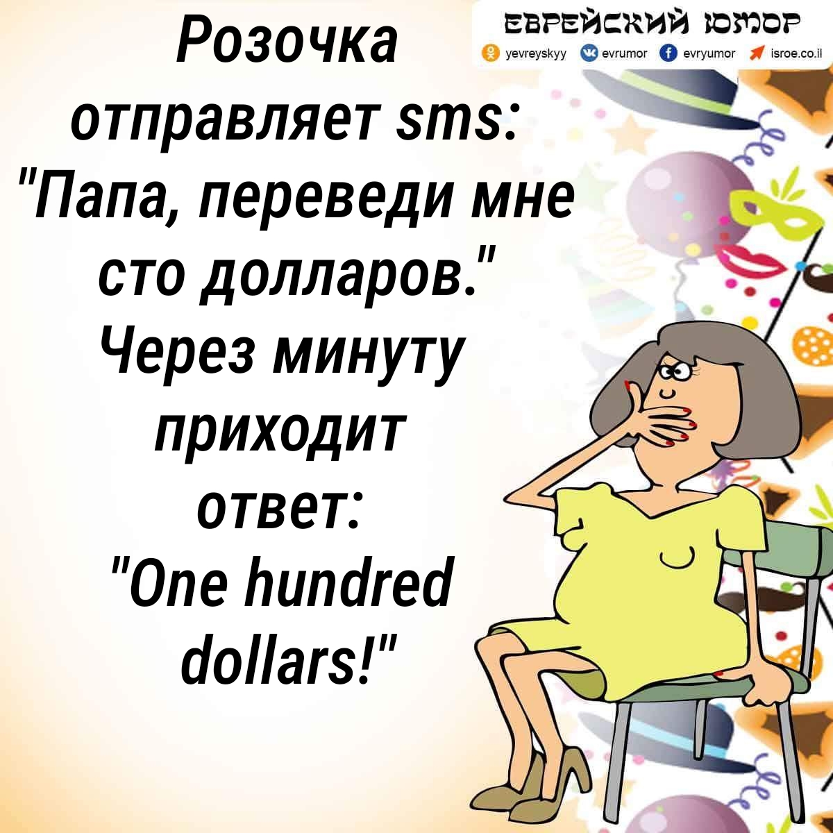 Абрам берет газету и читает: «Продается детская коляска. Интим не предлагать».