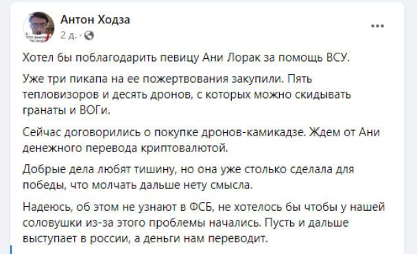 В частности, популярный украинский блогер Антон Ходза в Facebook поблагодарил Ани Лорак за помощь в покупке тепловизоров, дронов и пикапов для ВСУ, а также с иронией «понадеялся», что об этом ФСБ не узнает.