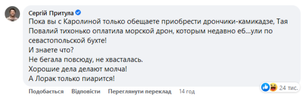 «Пока вы с Каролиной только обещаете приобрести дрончики-камикадзе, Тая Повалий тихонько оплатила морской дрон, которым недавно е*нули по севастопольской бухте! И знаете что? Не бегала повсюду, не хвасталась. Хорошие дела делают молча! А Лорак только пиарится!» – посмеялся над артисткой шоумен.