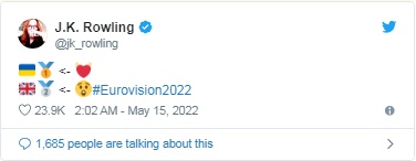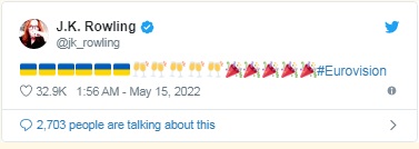 Известная британская писательница Джоан Роулинг, автор серии книг о «Гарри Поттере», отреагировала на результаты международного песенного конкурса «Евровидение 2022».