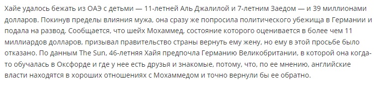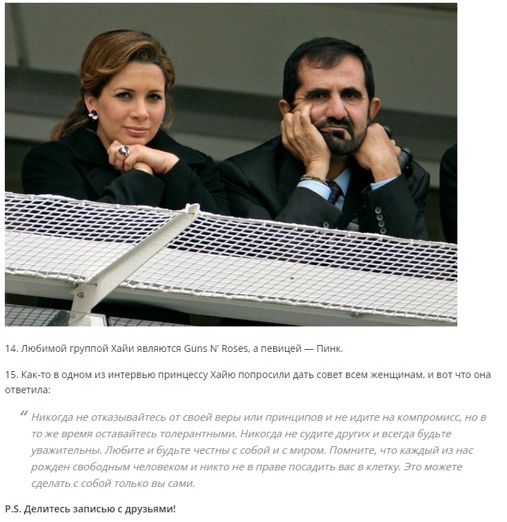 Эта восточная принцесса радикально отличается от других восточных женщин. Прежде всего тем, что она «посмела» дерзить своему супругу — правителю Дубая, проявила железную силу воли и сбежала из-под его контроля с двумя детьми и 39 млн долларов. Вот так-то.