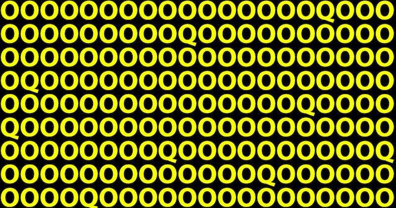 Тест, который мы предлагаем пройти, связан с поиском похожих предметов. На изображении зашифровали английские буквы Q. Сложность поиска состоит в том, что они хаотично разбросаны между букв O. Чтобы найти все зашифрованные символы, нужно сосредоточиться. Но не совершайте ошибку – не ищите Q долго. В этом случае результат будет неинформативным.
