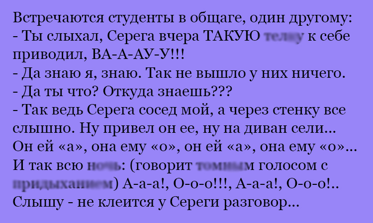 Соседи очень часто думают, что знают о тех, с кем они живут рядом, очень много. Однако, зачастую то, что они знают — это лишь плод их воображения и неправильной интерпретации происходящего. И именно так случилось с героями нашего первого анекдота — студент привел к себе в гости красивую девушку, а его сосед уже всем рассказывает, что у них ничего не вышло.