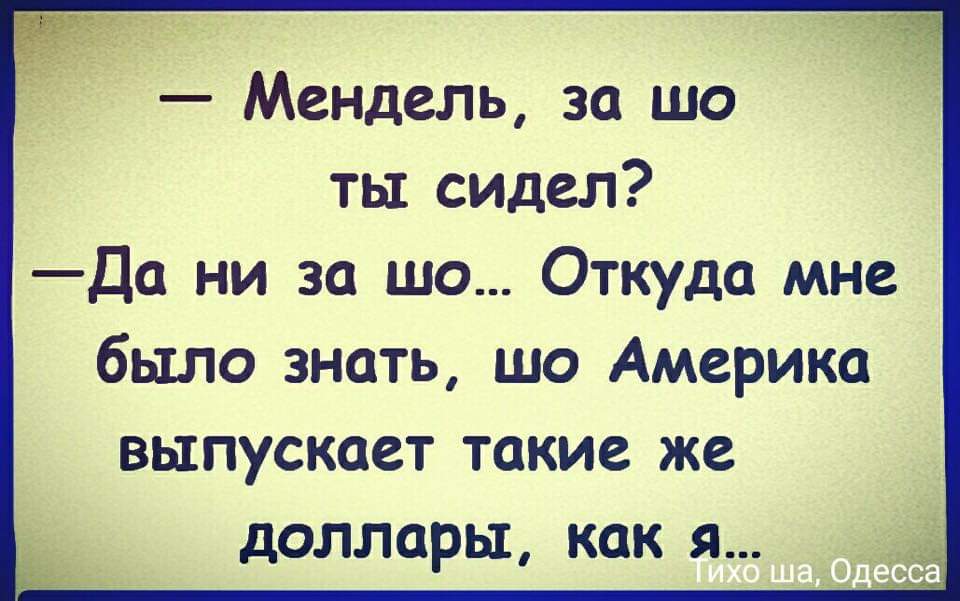 — Представляешь, Фима, вышел я сегодня погулять и вдруг вижу: лежит пачка 100-долларовых купюр в фирменной упаковке. Ну, поднял я ее, понес домой, но чувствую, что-то мне на душе неспокойно. Пришел, пересчитал… Так и есть! Одной не хватает!