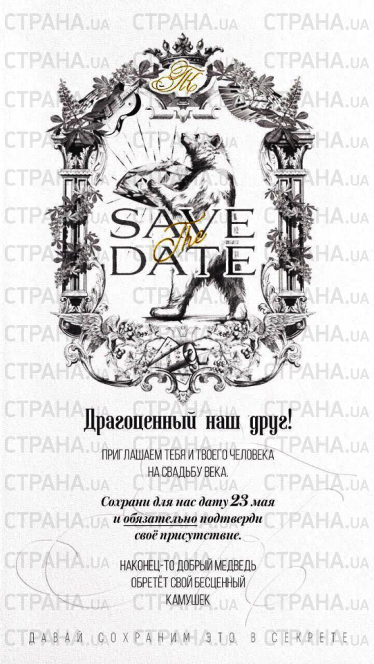 «Драгоценный наш друг! Приглашаем тебя и твоего человека на свадьбу века. Сохрани для нас дату 23 мая и обязательно подтверди своё присутствие. Наконец-то добрый медведь обретет свой бесценный камушек. Давай сохраним это в секрете», — написано на пригласительном.