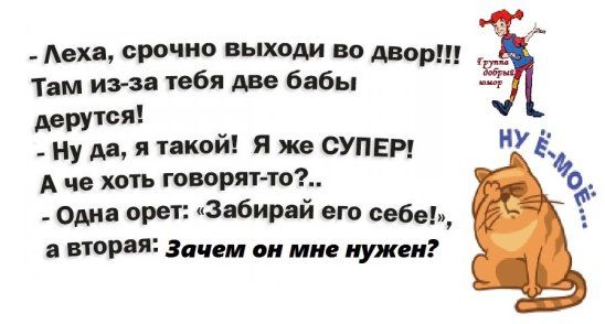 Спешим сообщить, что как ни крути, но выходные уже очень близко! А чтобы встретить их в приподнятом настроении, рекомендуем вам уже сейчас читать побольше юмора. Мы тут как раз собрали свежую порцию. Здесь анекдоты, веселые высказывания, забавные истории, уморительные цитаты. Одним словом, все, что действительно может создать позитивное настроение.