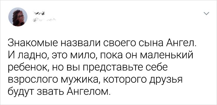 Я у мужа первая девушка. Вместе 7 лет. Сходила на УЗИ и узнала, что будет дочь, естественно, встал вопрос с именем. Муж хочет назвать Майя. У меня вопрос: почему именно это имя? Ведь так много других имен, которые бы лучше сочетались с фамилией и отчеством. Муж непреклонен, ведь в мае мы впервые поцеловались. © Подслушано / Ideer- У нас в группе была девочка-индуска, она представилась как Чандри Анамалай. Мы все 6 лет звали ее Чандри и только к концу обучения узнали, что это ее фамилия, а мы ни разу не назвали ее по имени за все это время. Было очень неловко. А в 1-м классе с нами учился Рю Сихён, я называла его Психён, но не специально, а просто так услышала. А он плохо говорил по-русски, и я не понимала, почему он так бесится. Тоже стыдно. © Аврора / AdMe