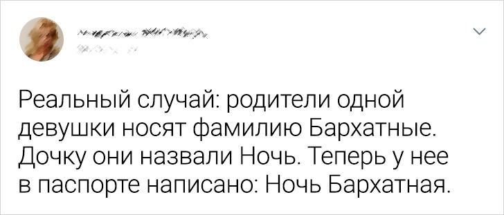 Мой отец — Сергей Пушкин. Меня назвали Александр. Я полный тезка писателя. Это особо никем не обыгрывалось: пара шуточек в школе, одна в универе, но, в принципе, всем было по барабану. До ЗАГСа. Там регистратор прослезилась от смеха: жену зовут Анна Керн. © Подслушано / Ideer- Был у меня друг с необычным именем. Его родители до рождения ребенка жили в селе. И случилась у жены задержка, а ей 48 лет. Фельдшер от нее отмахнулась, мол, понятное дело, климакс. Потом оказалось, что беременна. А мужик с юмором, он сына и назвал Климентием, или просто Климом. © Alexeich56 / Pikabu