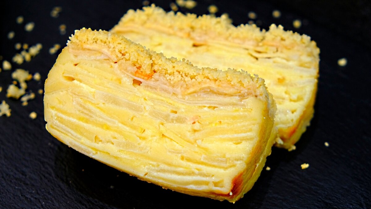 - С яблок снимаем кожуру, удаляем сердцевину и нарезаем их тонкими пластинами. Для удобства используем специально предназначенную для этого терку. Яблоки стараемся нарезать максимально тонко. От этого напрямую зависят вкусовые качества пирога. Если нарезка яблок занимает у Вас много времени или Ваши яблоки быстро темнеют, то их необходимо сбрызнуть лимонным соком. Затем, каждый яблочную пластинку аккуратно опускаем в тесто таким образом, что оно его полностью обволакивало. Да, это займет у Вас немало времени, но результат себя полностью оправдывает.