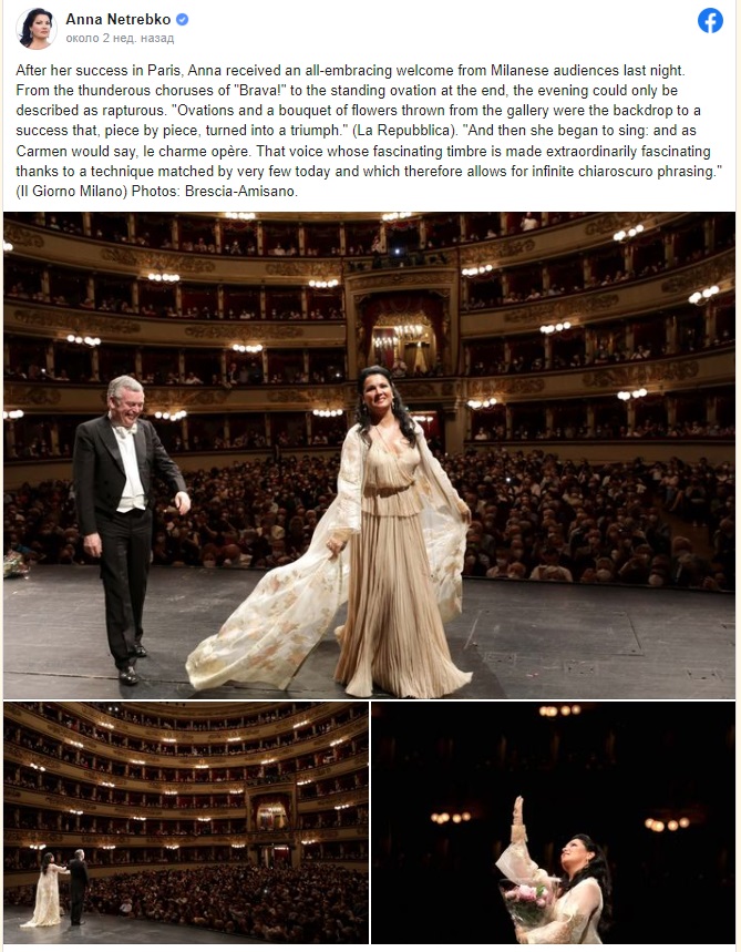 «После Парижа Анну приветствовали миланские зрители», – сообщается в следующем посте на странице Нетребко.