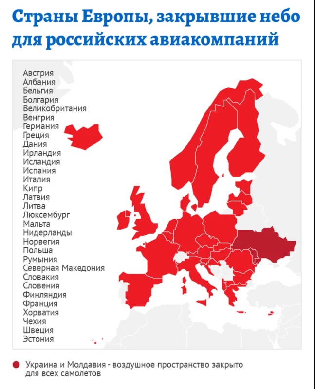 Ниже приведён список стран по состоянию на 28.02.2022 года, куда теперь не полетит россия: