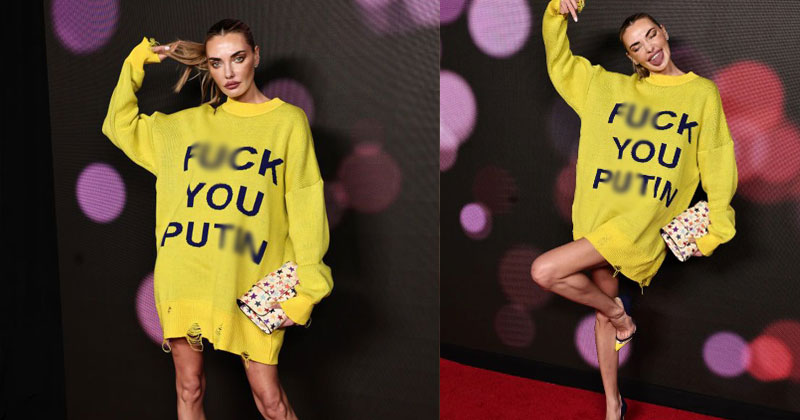 Украинская супермодель Алина Байкова вышла на красную ковровую дорожку Недели моды в Ньо-Йорке в удлиненном вязаном свитшоте от украинского бренда Vip Luxury Edition. Надпись на платье указывает правильное направление нынешнему российскому диктатору.