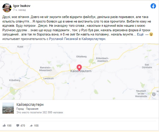 «О месте и времени похорон в Киеве напишу дополнительно. Безгранично благодарен всем. Мое состояние сейчас опишу синонимами: раздавленный, сломленный, уничтоженный. Знаю, что это бы никогда не понравилось жене», – подытожил Исаков в своём посте.