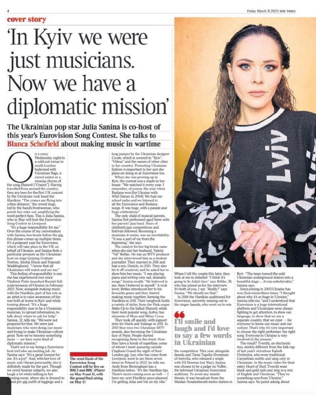 «Украинский музыкант на обложке легендарного The Times. Развернутое интервью о The Hardkiss, Евровидении, жизни. Но самое главное — мне дали возможность озвучить важные месседжи: культура и спорт не могут быть «вне войны и политики» и почему преступникам не место на «Евровидении», – поделилась Санина этим событием в Instagram.