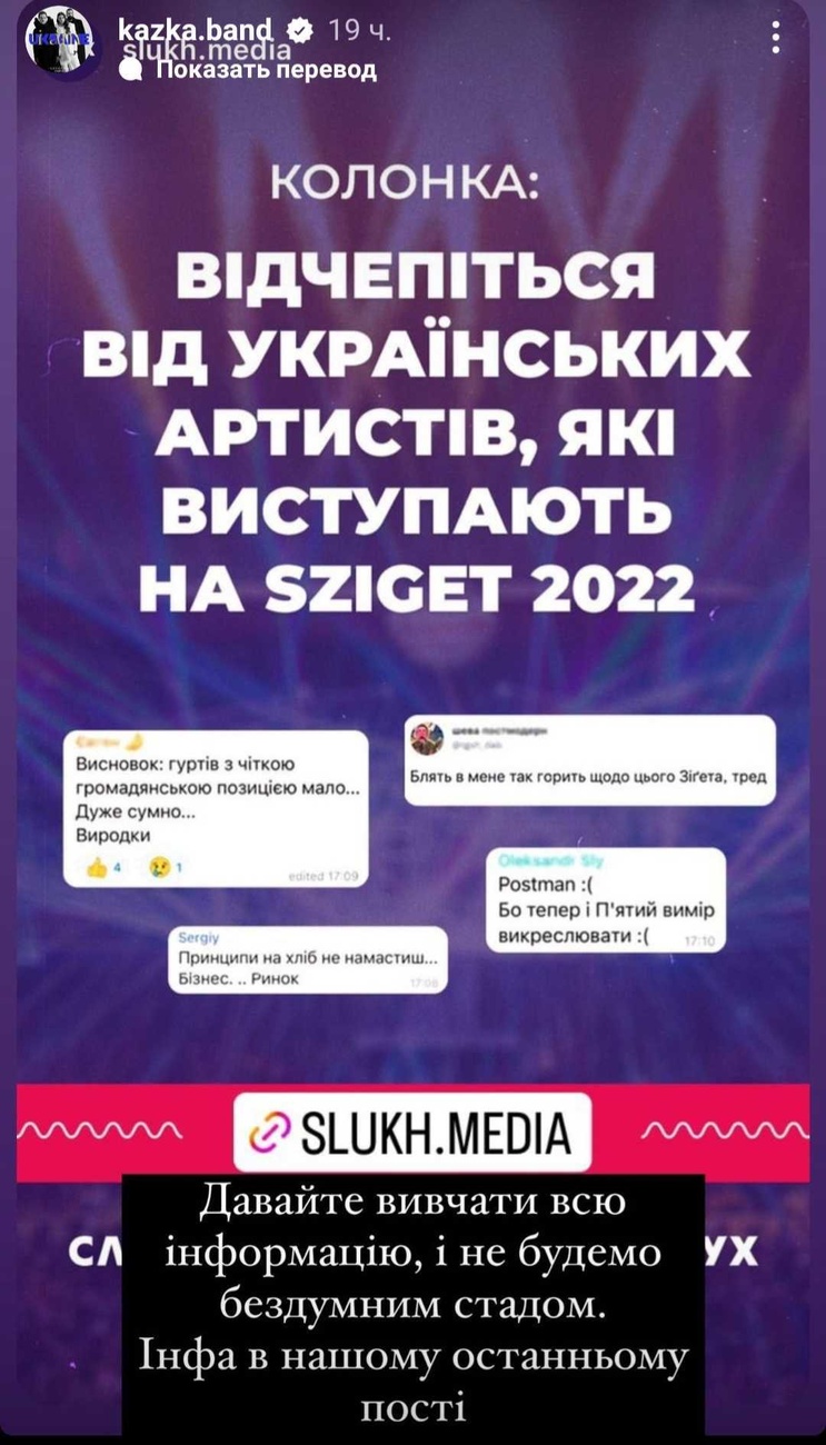 На днях украинская группа Kazka заявила, что примет участие в музыкальном фестивале Sziget, который проходит в Будапеште в середине августа. Соответствующее заявление музыканты выставили на своей странице в Instagram. Информация вызвала целую бурю негодования среди поклонников группы, так как на этом же фестивале заявлено выступление российской диджейки Нины Кравиц, которая замалчивает вoйну рф против Украины.