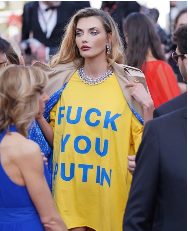 В частности, украинская модель Алина Байкова, не смотря на все запреты, решилась на смелый образ для появления на красной ковровой дорожке. Она выбрала платье-футболку с надписью-посланием к кровавому диктатору рф. Цвета одежды были желто-голубые — под цвет украинского флага.
