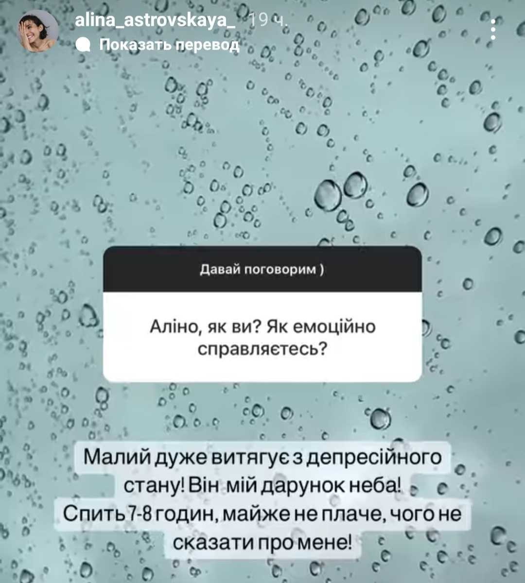 Также, отвечая на вопросы своих подписчиков, Астровская призналась, что в последнее время её преследует депрессия, а малыш помогает ей побороть в себе эти негативные эмоции. На украинском языке ведущая призналась, что всё время плачет.