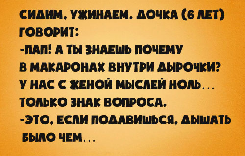Рабочий день понемногу подходит к своему логическому окончанию, и сейчас самое время подумать чем Вы будете радовать себя в этот холодный мрачный вечер, дабы сделать его приятным. Побалуйте себя немножко — купите любимые вкусняшки в магазине или просто позвольте себе сегодня не стоять у плиты и закажите ужин с доставкой на дом, отложите все дела и просто посмотрите интересный фильм, лежа на диване и обнимая любимого человека, поболтайте по телефону с друзьями, за которыми уже давно соскучились, нон никак не можете выкроить время для общения… Есть масса вариантов как даже такой некомфортный с точки зрения погоды вечер провести с удовольствием. Главное — это чтоб у Вас на душе было светло и солнечно, и наша порция яркого юмора гарантированно настроит Вас на самый позитивный лад.