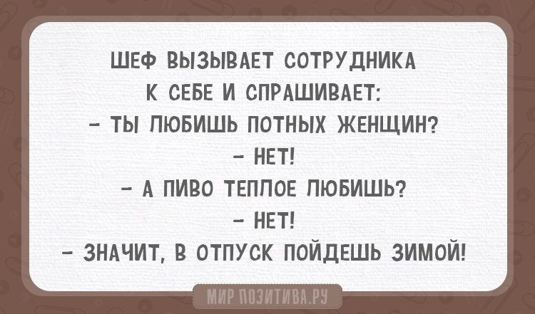 С юмором по жизни идти гораздо легче. И тем более легче работать. Особенно, если прочесть нашу позитивную подборку веселых историй и анекдотов о трудовых буднях. Возможно, в какой-то из этих открыток вы узнаете себя или своих коллег. А если даже этого не случится, то в любом случае, актуальный, искрометный юмор – это всегда залог хорошего настроения.