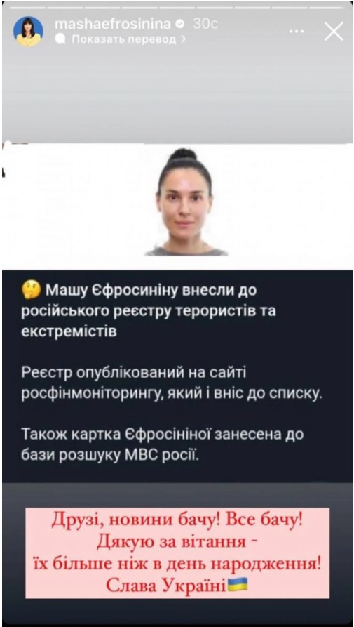 Популярная украинская телеведущая и светская львица Маша Ефросинина попала в «черный» список рф. Так, страна-тeppopucт причислила Ефросинину в категорию террористов и экстремистов. Об этом сообщил официальный сайт полицейских страны-агрессора.