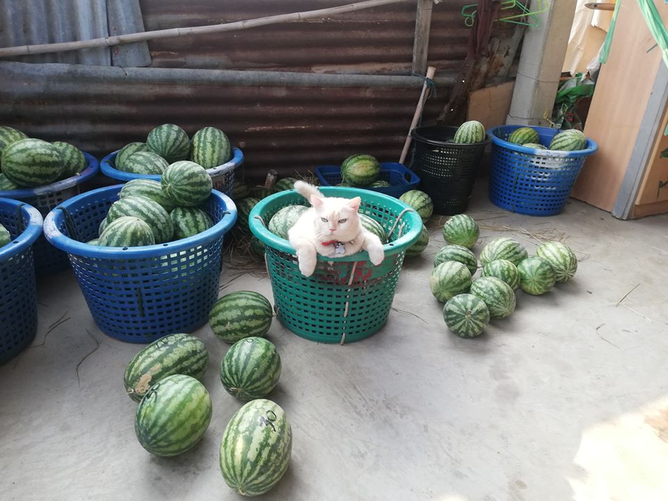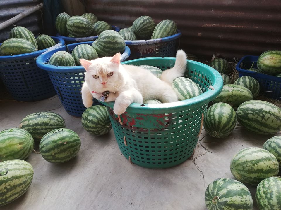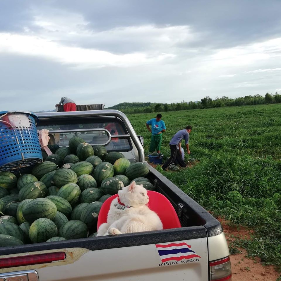 Этот белый, но далеко не пушистый котик из Таиланда стал настоящей звездой сети Фейсбук. Всё благодаря своему грозному взгляду, который красноречиво сообщает – к арбузам лучше не подходить. Его зовут Жемчужина, и он знает толк в охране этих больших ягод. Потому что уже 6 лет работает сторожем урожая своих хозяев. И, конечно, такой большой опыт даром не прошел.